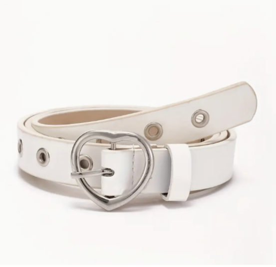 Cinturón de cuero sintético color blanco, con hebilla plateada de corazón.